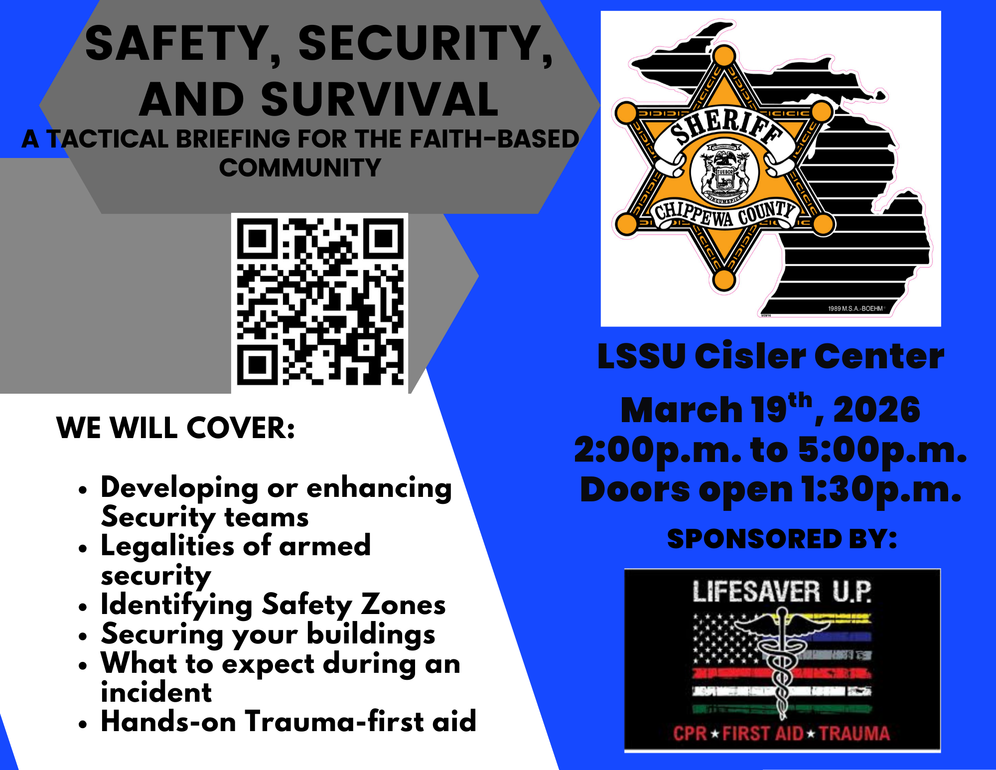 Safety Training at LSSU Cisler Center. Scan the QR Code on the bulletin board in the foyer of the church to register for this event. There is no cost to attend.